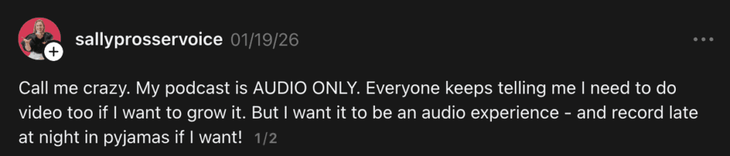 Second: It (typically) adds a barrier to recording, because people feel like they have to be “camera ready” every time they want to record an episode. If you’re only recording audio, you can record at any time looking any kind of way. Threads user sallyprosservoice posted about this: